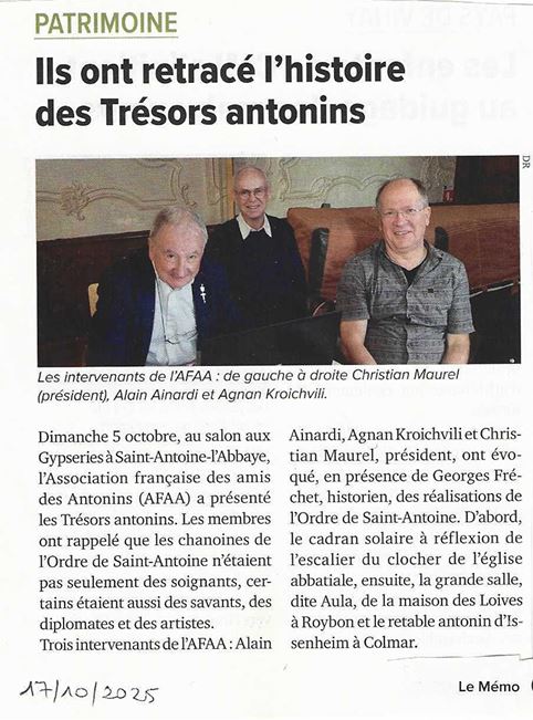 - Le 26 avril 2025, Assemblée générale et Conseil d'Administration de l'Association Française des Amis des Antonins, à Saint-Antoine-l'Abbaye.