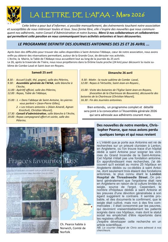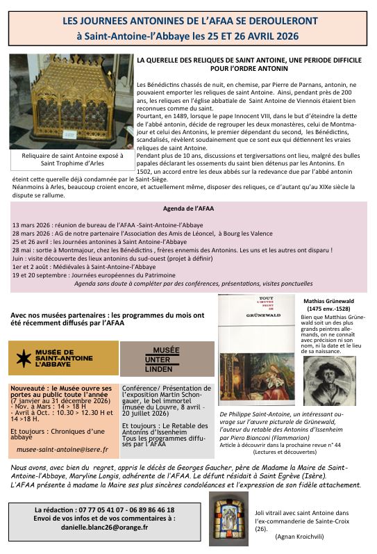 - Le 26 avril 2025, Assemblée générale et Conseil d'Administration de l'Association Française des Amis des Antonins, à Saint-Antoine-l'Abbaye.
