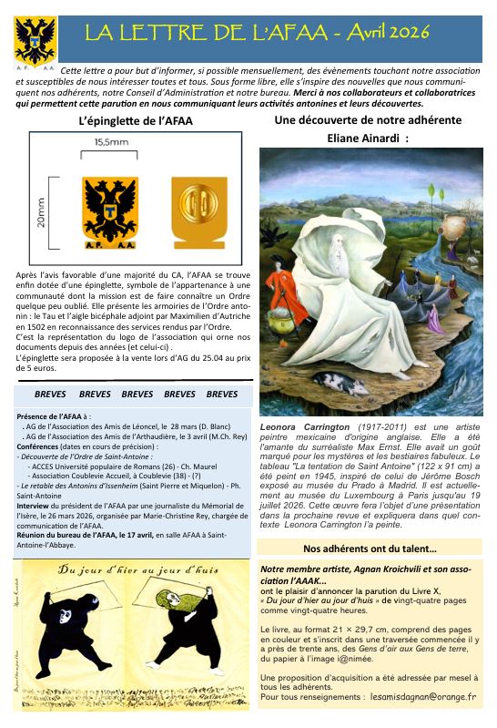 - la convocation des membres de l'AFAA à l'Assemblée générale du 25 avril et l'invitation aux journées antonines des 25 et 26 avril 2026